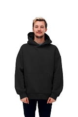 Большой капюшон, карман-кенгуру, чисто-черный цвет и всё, ничего лишнего.