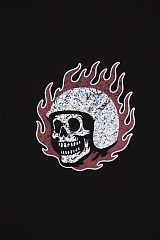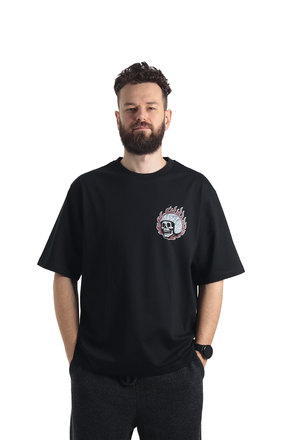 Эта новинка для тех, кому по душе скромные, но говорящие детали. С виду обычная базовая черная футболка, а на груди — он — маленький черепок в шлеме. Куда-то несется, спешит, горит. Натурально мы!