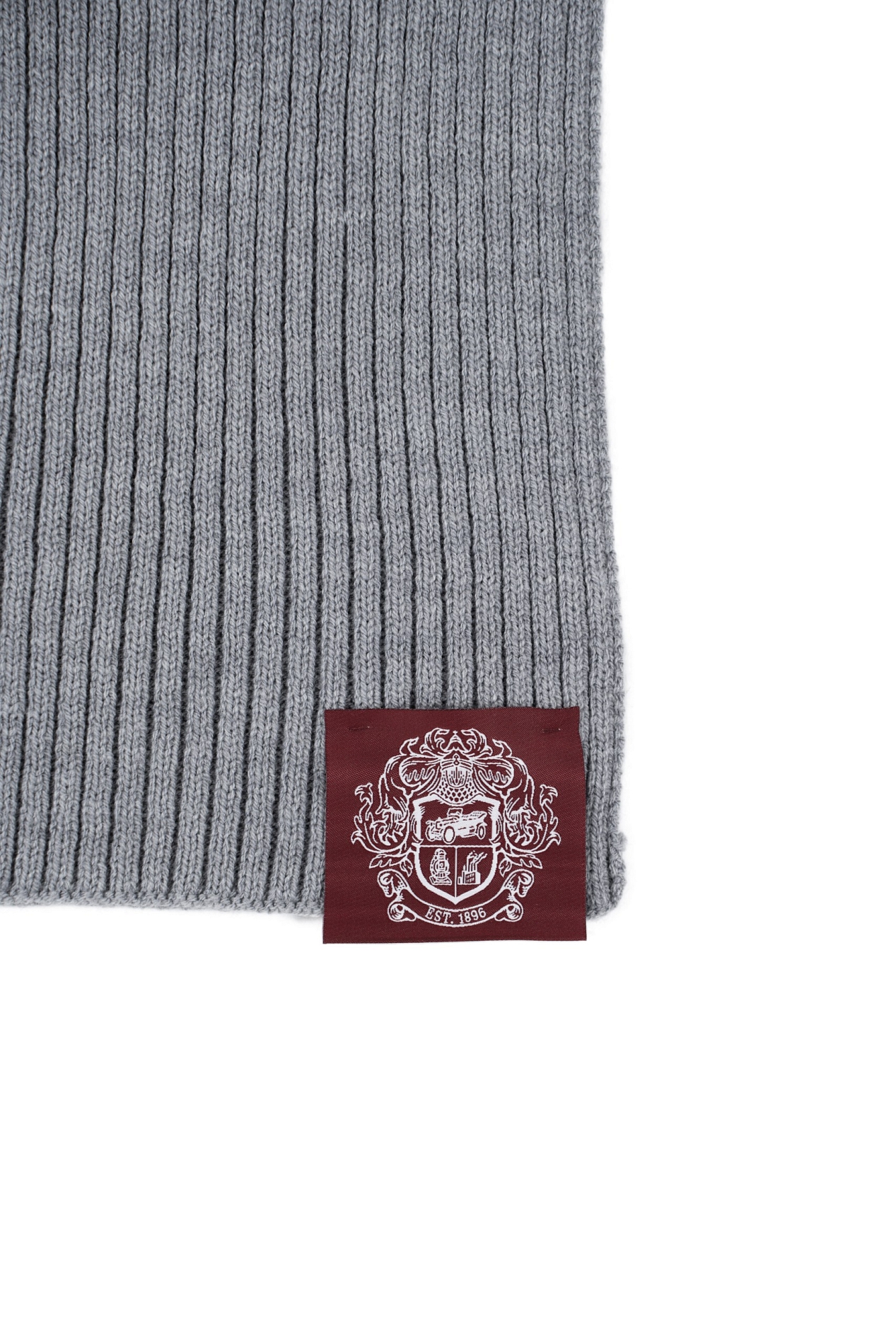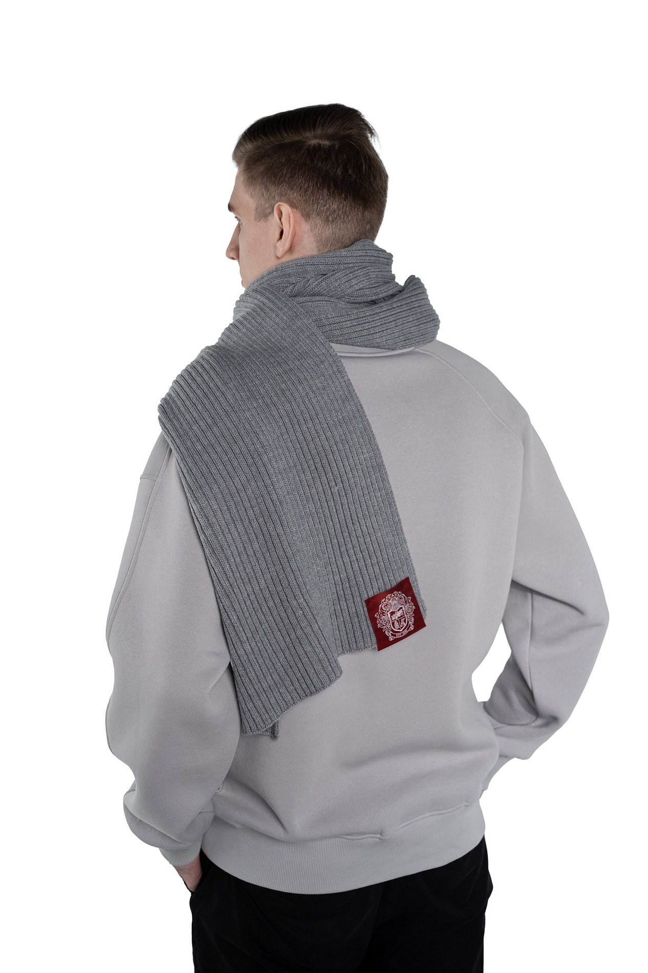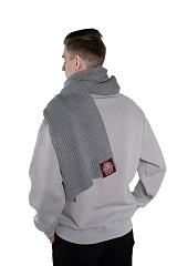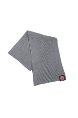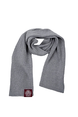 Серый-серый, длинный-длинный, шерстяной-шерстяной. В составе 55% шерсти, а на одном из концов пришит фирменный герб.